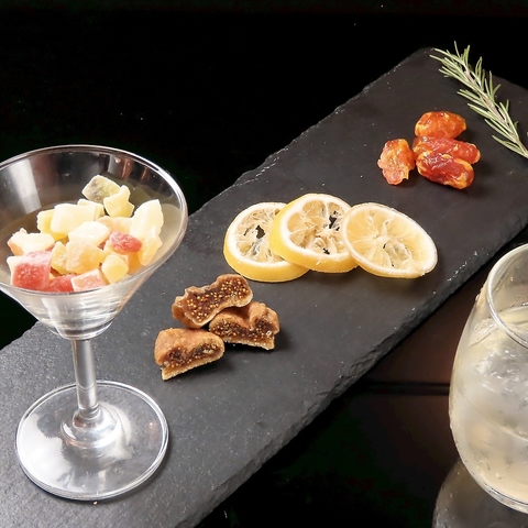 見た目にも華やかなドライフルーツを4種類盛り合わせました。自然な甘みと酸味が心地よく、ウィスキーや赤ワインなど、芳醇なお酒のお供に最適です。食後のデザート代わりにも楽しめる、ちょっと大人なひと皿。彩り鮮やかで、写真映えも抜群です。