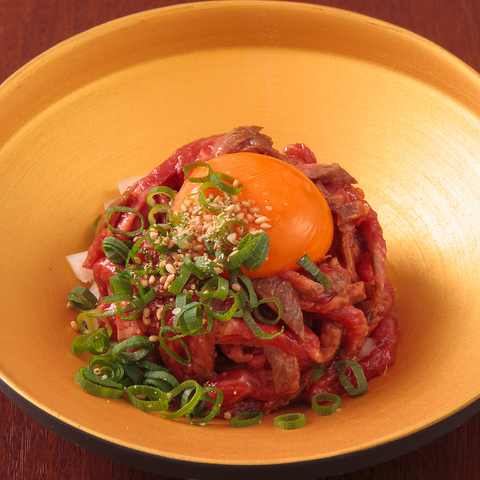 山形県が誇る黒毛和牛を一頭買いで仕入れ、部位ごとに最適な調理方法で提供しております。月齢30ヶ月以上の未経産のメス牛を仕入れております。牛肉格付A-4以上になります。旨み・香・脂のキレ、そのすべてに自信をもって提供させていただきます。高鮮度な黒毛和牛を是非ユッケでお楽しみください。アボカド炙りユッケのご用意もございます。