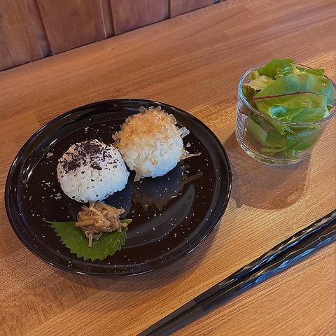 下記のドリンクからお好きなものをお選びください。/ミニおにぎりとサラダのヘルシーなモーニング。