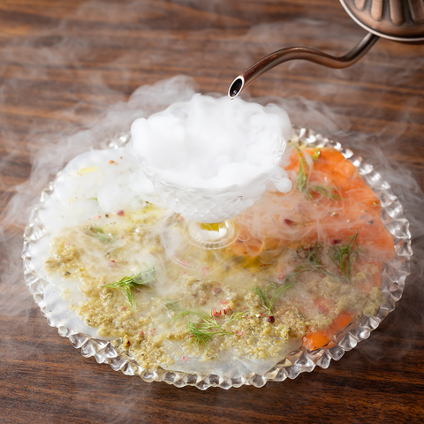 ドライアイスの煙を使った、見た目も楽しい華やかな一皿◎写真や動画に収めたくなる演出で、お食事の時間をさらに盛り上げます♪