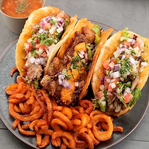 ジューシーな牛肉と香り高い茸をガーリックオイルで風味豊かなビーフタコスやチキンタコス、ポークタコスの3種類です♪