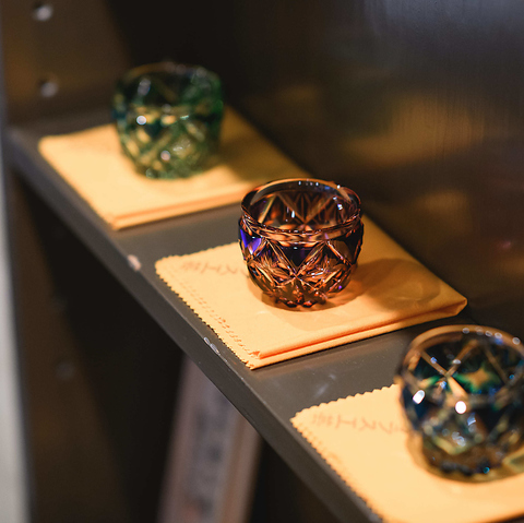 薩摩切子の美しさと共に種類豊富なお酒を楽しむことができます。透明感のある美しいグラスで格別な1杯を。