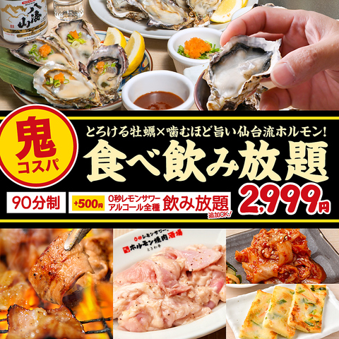 酒・料理が足りないなどの心配無用!ぷりっぷり牡蠣&名物ホルモン、W濃厚を食べ尽くせ♪旬の牡蠣・塩ホルモン・焼肉・サイドメニューを思う存分楽しめる「食べ放題&飲み放題コース」が大人気♪今なら+500円で「0秒レモンサワー飲み放題」&アルコール飲み放題も追加OK!驚愕の”2,999円”からと鬼コスパを実現!