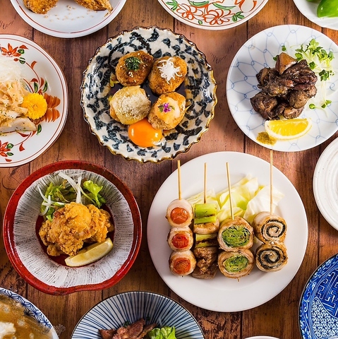鹿児島県産薩摩地鶏や九州産のブランド鶏を使用!毎日仕入れる朝びき鶏を丁寧に1本ずつ串打ちし、最高級の備長炭で焼き上げます。くせもなく一番美味しい状態の朝びき鶏をお愉しみください。大阪メトロなんば駅徒歩3分とアクセス抜群ですので、各種宴会にお勧め◎焼き鳥付き!!食べ飲み放題2500円~★