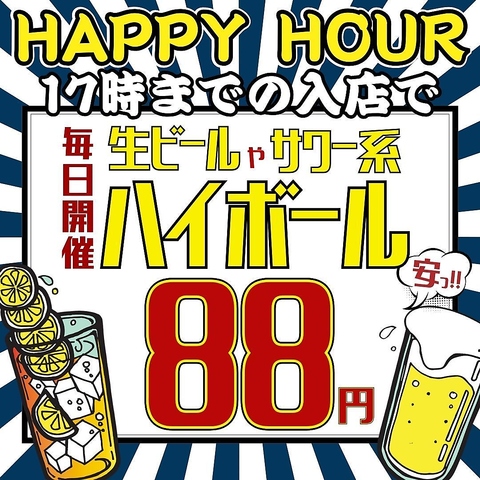 【ハッピーアワー★88円】平日17:00まで注文/土日祝日16:30まで注文!生ビール/ハイボール/サワー