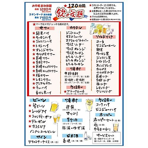 2時間制飲み放題となります♪延長は1時間につき880円(税抜)をいただいております。飲み放題メニューはサワー、カクテル、焼酎、ハイボールなど豊富に取り揃えております。【+200円で生ビール・日本酒含むスタンダード飲み放題に変更可能です!】