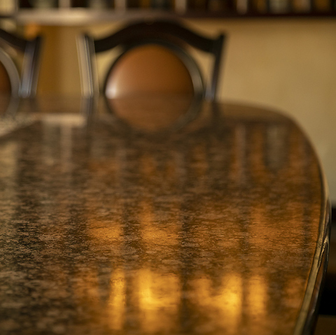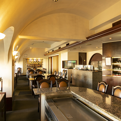 イタリアから直輸入した天然石のテーブルは、現在では入手困難な貴重品です。贅沢な内装は、シェフが目の前で焼き上げるお料理の、最高のスパイスとなっています。