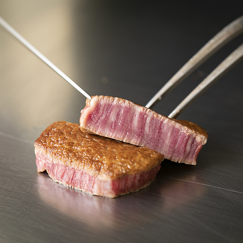 美味しいステーキを提供するため、産地やブランドをあえて限定せず、厳選を重ねたA4・A5ランクの黒毛和牛を仕入れております。細かくサシの入った上質なお肉は、やわらかく脂の旨み・甘みに優れた格別の味わい。注文を受けてから、塊肉を切り出した分厚いお肉を目の前で調理し、焼き立てをお召し上がりいただけます。