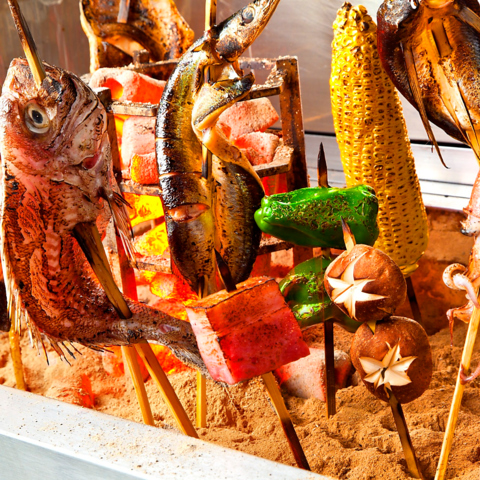 鮮度抜群の直送鮮魚をはじめ、上質な和牛や新鮮なお野菜を炉端焼きでご提供致します。日本で伝統的な調理方法である『炉端焼き』。当店では様々な食材を丁寧に火入れすることで、ふっくらジューシーな味わいの鮮魚や旨みたっぷりなお肉やお野菜をお楽しみいただけます