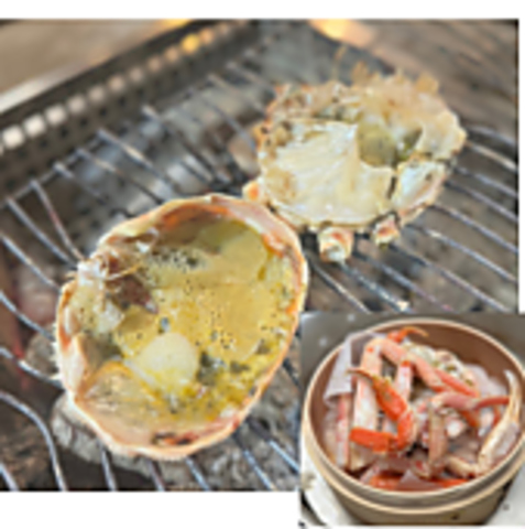 厳しい寒さの中を力強く生き抜いた甘味のある天然の蟹(ズワイガニ属)を北海道から生きたまま直送。◎蟹の甲羅に蟹味噌と日本酒を注いで囲炉裏の炭火で炙り蟹の旨みを最も限引き立てる至極の贅沢!芳醇な香りとお口に広がる蟹の深い味わい。蟹の身をお楽しみいただいた後の蟹味噌と甲羅をスタッフへお渡しください。3900円(税込)