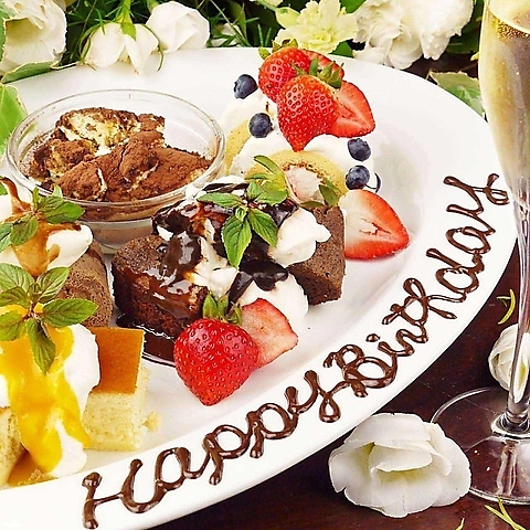 大切な人へのお祝いにぴったりの、華やかな特製バースデープレートをご用意。お名前やメッセージを添えたチョコレートアートで、サプライズ感も満点!彩り豊かなスイーツを盛り合わせたプレートは、味はもちろん写真映えも抜群です。誕生日だけでなく、記念日や歓送迎会などにも対応可能。ご予約時にメッセージ内容をご指定いただけます!
