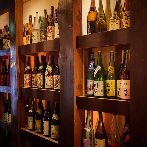 通路の壁に設えた棚には、石川・富山の地酒を美しくストック。日榮、手取川、菊姫、加賀鳶、神泉、満寿泉、農口尚彦研究所など、希少銘柄が和モダンな空間を演出します。定番はもちろん、新しい味に出会えるのも魅力。料理を待つ時間さえ楽しくなる、日本酒好きの心をくすぐる一角です。