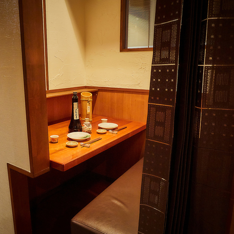 【ふたりの時間を心地よく過ごせる"横並び2名半個室"】向かい合わず過ごせる横並びの2名半個室は、料理の美味しさを自然に共有でき、会話も弾む特別な席。周囲をほどよく遮る落ち着いた空間で、デートやゆっくり話したい夜にも最適です。3席限定のため早めに埋まりがち。ご予約はネット予約で席タイプ指定が可能です!!