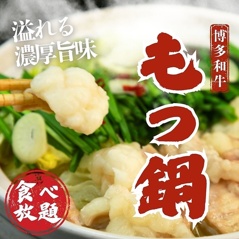 他では味わう事のできない博多和牛もつ鍋をなんと食べ放題にてご提供!お口の中で広がる上質な旨味がたまりません。こだわりの濃厚醤油/コクが半端じゃない味噌のスープは中毒性を引き起こします。食べの飲み放題プランは2,980円~ご用意!心も体もあったまる!