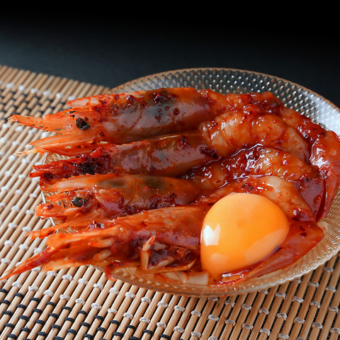 ぷりぷりの生赤エビを特製の旨辛ダレで漬けました。卵黄でまろやかに
