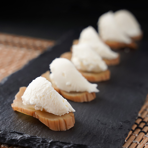 自家製クリームチーズは酸味が少なく、超クリーミー。いぶりガッコとの相性も◎カリコリの食感となめらかなクリームチーズがたまりません。三河赤鶏のレバームースは臭みの少ないレバーだけを使用した一品。
