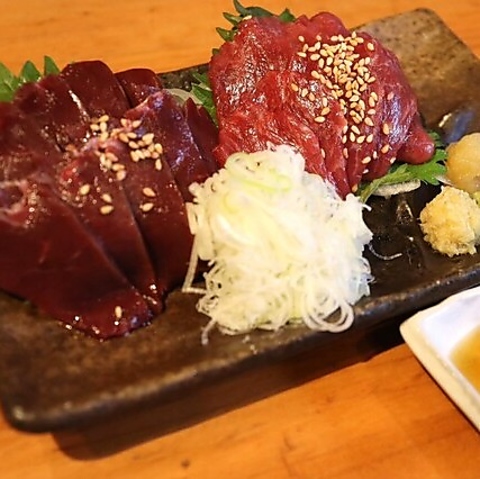 馬刺しは熊本から直送。専用の畜場と工場も所有していて、そのみずみずしさから「鮮度馬刺し」とも呼ばれます◎赤身や霜降りはもちろん、数量限定の「レバ刺し」はごま脂と塩でご堪能ください。希少部位の「フタエゴ」は脂と赤身のコントラストが美しく、当店のマネージャーも大好物です。ぜひ一度ご賞味ください♪