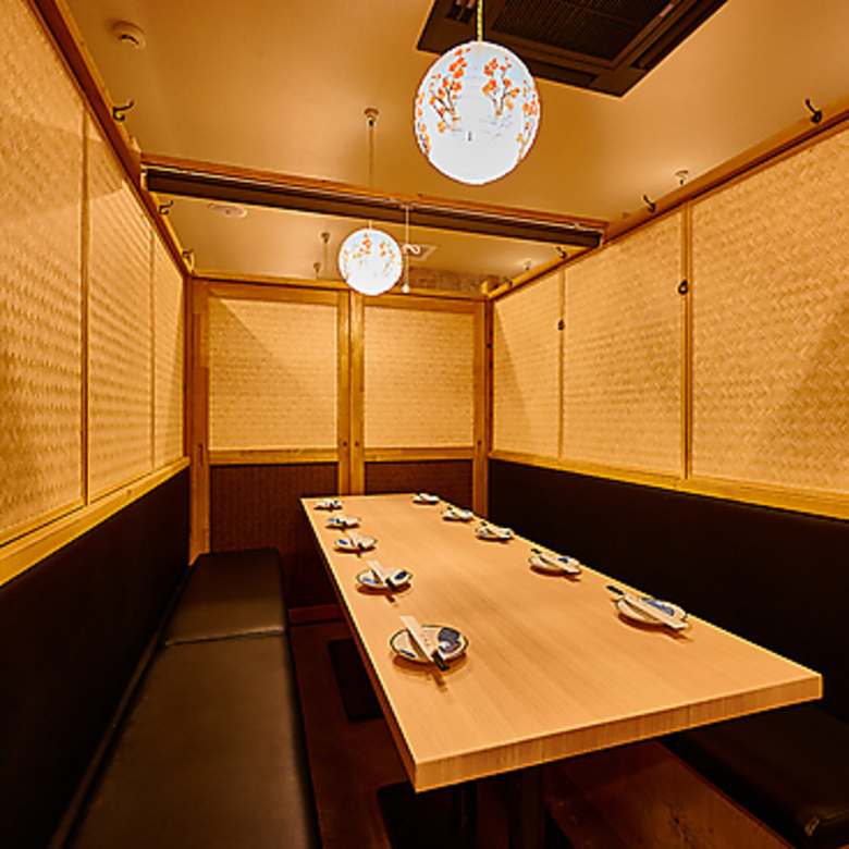 【完全個室完備】店内に入ると隠れ家のような寛ぎの空間が広がります。個室席は2名様から団体様まで幅広く対応!最大70名様までの個室もご用意可能です。お仕事帰りの飲み会、接待や二次会、各種ご宴会をお楽しみください。飲み放題付コースは多様な価格帯でご用意しております◎ただいま飲み会・宴会のご予約受付中!
