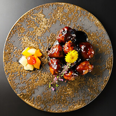 [上海本店の看板メニュー“窯焼き”]上海本店秘伝のタレにじっくり漬け込んだお肉を大きな円柱の専用窯に吊るしながら熱風でじっくり焼き上げる中国伝統の窯焼き。皮の触感と味わい深い香りはまさに星付き品質でワインや紹興酒とのペアリングがおすすめ。