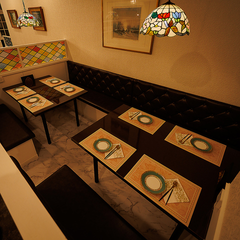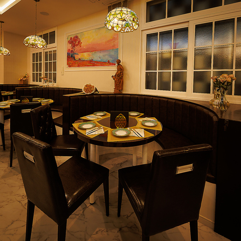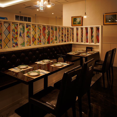 白を基調とした広々空間に、細部まで拘りの装飾が施されています。大理石調のテーブルやレザーのソファーに、ステンドグラスの間仕切りが彩りを添えます。他にも有名絵師へご依頼をさせていただき、時間をかけて天井や壁に直接描いていただいた絵画も圧巻です。地中海を彷彿とさせる優雅な空間にて、日常を忘れてごゆるりとお寛ぎ下さいませ。
