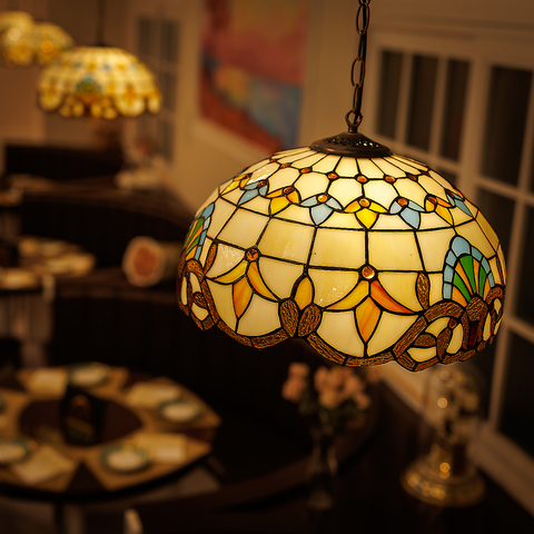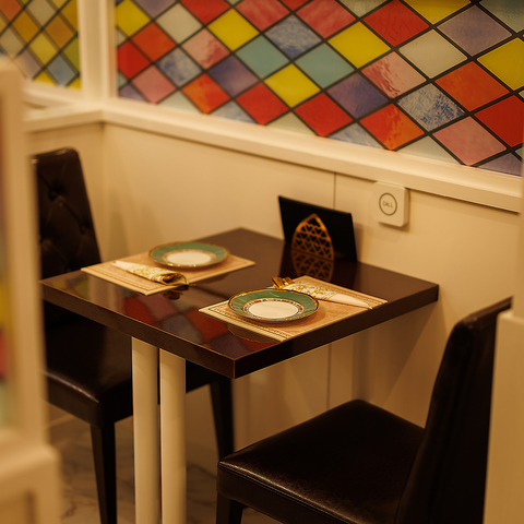 《非日常空間》美しい絵画やステンドグラスを一望できる非日常空間。店内に一歩足を踏み入れると、まるで地中海に広がる爽やかで幻想的な空間。1つ1つ手作業で制作した絵画の雰囲気は、まさに圧倒的な臨場感。ゆったりとした照明と絵師が手掛けた天井が、優雅でロマンティックなひとときを演出します。