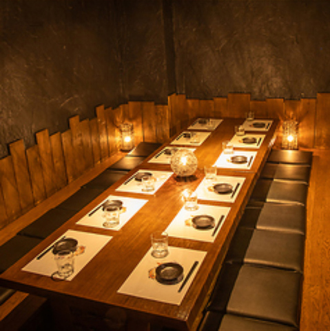 木の温もり溢れる個室空間は、まさに大人の秘密基地!ふんわりとした照明が心地よく、落ち着いた雰囲気でゆったりと過ごせます!片側シートで楽ちん、向かいには背もたれ付きの椅子も完備!人目を気にせず楽しめる空間だから、会話もお酒もすすむこと間違いなし!接待・デート・女子会にもピッタリの完全個室です!