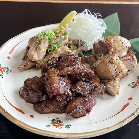 鉄板で香ばしく焼き上げた鶏もも肉・鶏レバー・ヤゲン軟骨を、複数名でも取り分けやすいよう一皿に盛り合わせてご提供いたします。