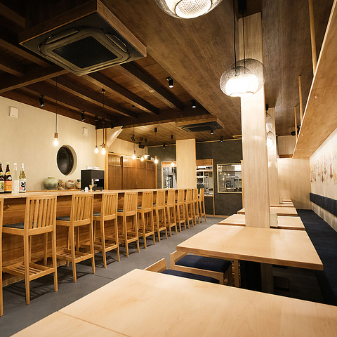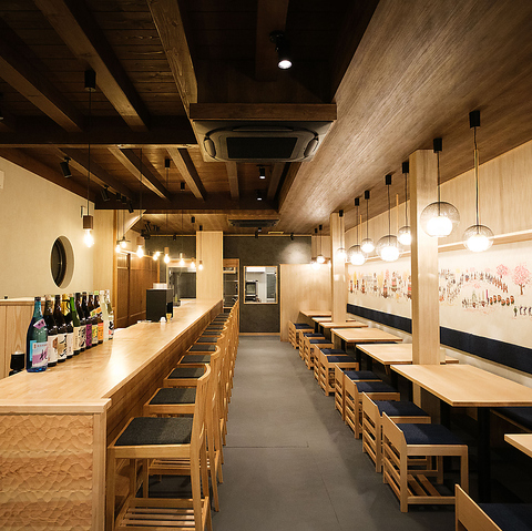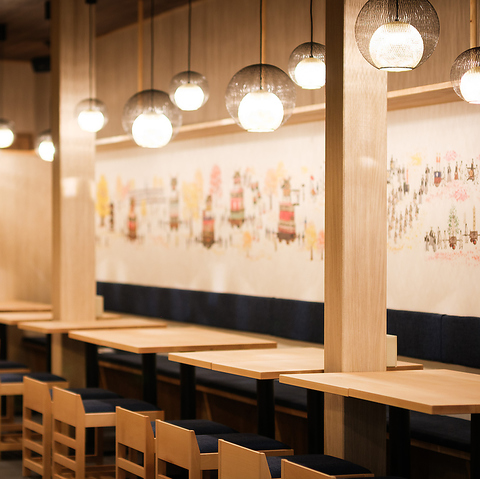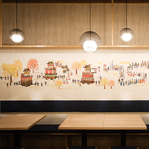 8mを超える圧巻のロングカウンター、またテーブル席の壁面には美円を訪れるお客さまに幸せが訪れるようにと高山祭りの絵が10m以上に及んで描かれています。お仕事終わりや友人との飲み会、接待や会食など大切な日のお食事まで様々なシチュエーションに合わせてご利用いただけます。