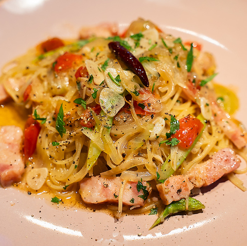 当店の人気No.1パスタ!定番のペペロンチーノを具材たっぷりで仕上げました。