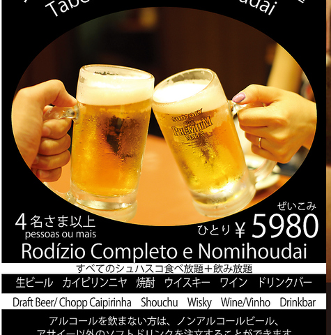 【含まれるDrink】生ビール・カイピリンニャ(ブラジルの人気カクテル)・焼酎・ウィスキー・ワイン・ドリンクバー