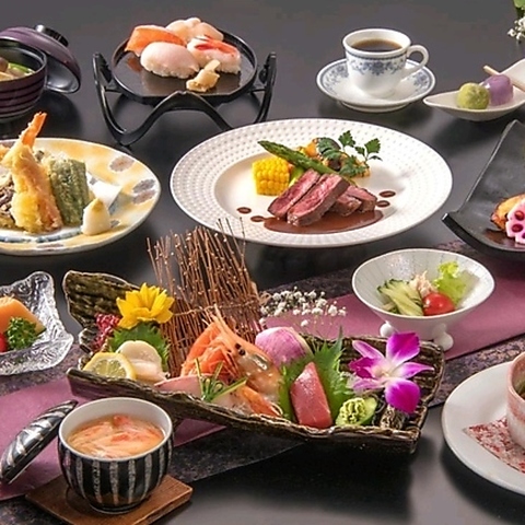 和食・洋食・中華、それぞれのジャンルの美味しいところを詰め込んだ御膳やコースをご用意。刺身や天婦羅といった和の定番から、ステーキなどの洋食、エビチリといった中華まで、一度に多彩な料理を楽しめるのが魅力です。宴会や接待、ご法要、ご家族のお祝いなど、幅広いシーンでご利用いただけます。