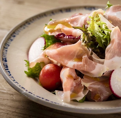スペイン産生ハムの豊かな旨みを新鮮野菜と一緒に味わう贅沢サラダ。