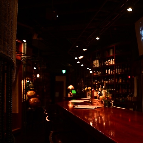 お酒の瓶がずらりと並ぶバーカウンターは、落ち着いた大人の雰囲気です。お一人様でも気兼ねなく、お食事やお酒を楽しめます♪
