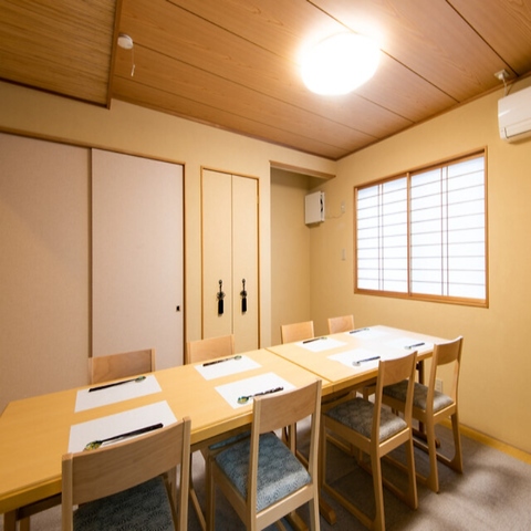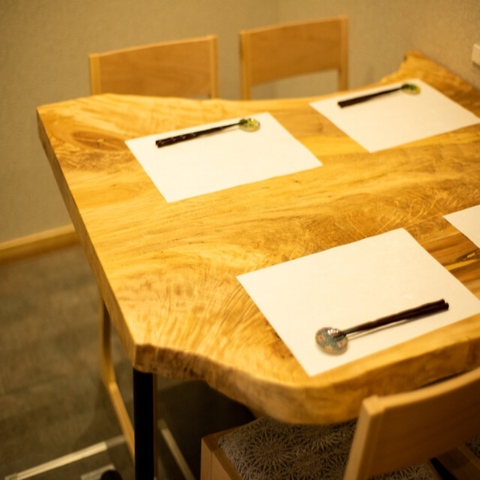 店内中央には、木の温もりを感じられる一枚板の立派なカウンター席をご用意しております。お客様同士の距離感を大切にした配置と、落ち着いた照明の空間で、ゆったりとお食事をお楽しみいただけます。板場との距離も近く、職人やスタッフが目配り・気配りを行い、細やかなサービスを心がけております。心地よい空間で心ゆくまでお過ごしください