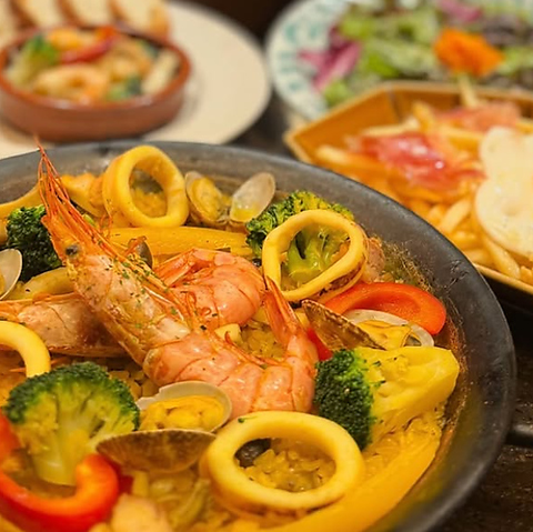 当店の自慢は、20種類以上もの多彩なバリエーションでご用意しているパエリアです。魚介をふんだんに使用した贅沢な定番メニューから、イカ墨のコクと旨みが広がる個性的な一品まで、お好みに合わせてお選びいただけます◎女子会や大人数でのご宴会など、人数やシーンに合わせてコース料理やドリンクとともにお楽しみください!