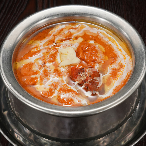 生クリーム、バターで仕上げた鶏肉のマイルドなカレー/セットはナン又はライス、サラダ、ソフトドリンクが付きます。おかわりナン又はライス1回無料。