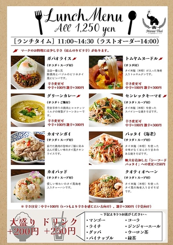 <平日限定>ガパオライス、カオマンガイ、パッタイ、グリーンカレーなど、当店を代表する人気メニューを、ランチタイム限定でサラダ・揚げ物・スープを付けたお得なセットメニュー(1,250円~)としてご用意しております。お昼からリーズナブルなお値段で本場の味をご堪能ください。