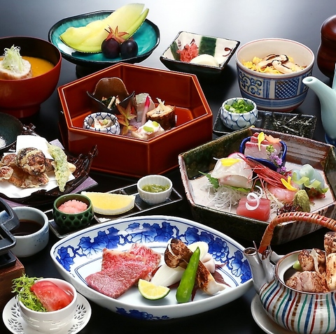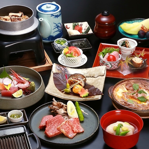 ~メニュー内容~前菜:季節の前菜三種 A5等級飛騨牛ロースト 子持ち鮎煮浸し 飛騨法蓮草焼き松茸和合/椀物:清汁仕立て 萩花真蒸/造り:三種盛り 飛騨醤油/温物:A5等級飛騨牛柳川仕立て/焼物:焼き吹寄せ カマス幽庵焼き 焼栗 公孫樹芋 紅葉麩/凌ぎ:飛騨蕃茄サラダ/強肴:A5等級飛騨牛三種鉄板焼き フィレ サーロイン サーロイン酒粕味噌漬け/食事:A5等級飛騨牛松茸釜飯 薬味 出汁/水物:本日の水物