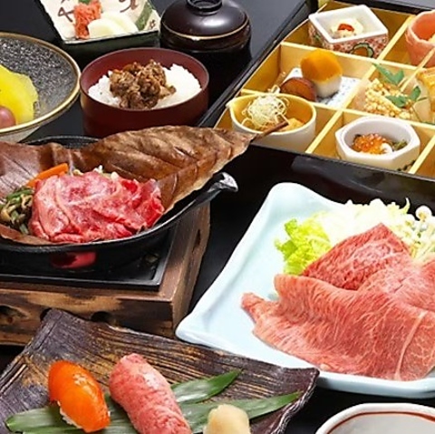 ~メニュー内容~炙り寿司:A5等級飛騨牛 トラウトサーモン/前菜:季節の前菜五種/造り:二種盛り A5等級飛騨牛ロースト 飛騨醤油/鍋物:A5等級飛騨牛すきしゃぶ/凌ぎ:飛騨滑子卸し蕎麦/焼物:A5等級飛騨牛朴葉味噌焼き/食事:国産米/水物:本日の水物