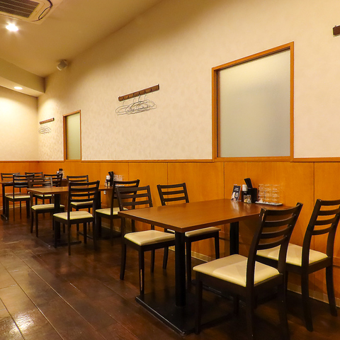 白い壁と温かみのある木目調のフロアが調和した、モダンで明るい雰囲気。広々とした空間にテーブル席がゆったりと配置されており、清潔感あふれる内装で心地よくお食事を楽しんでいただけます。広々空間でリラックスできる空間を演出。周りを気にせず、ご家族や友人とのお食事に最適です◎