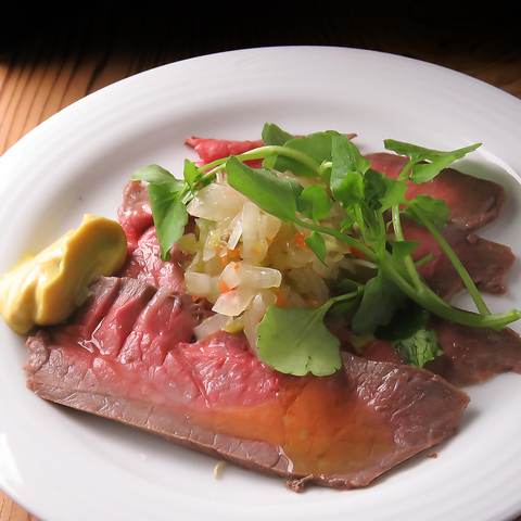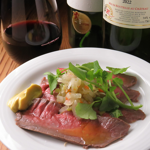 厳選された国産和牛を使用し、低温でじっくりと火入れすることで、驚くほど柔らかくしっとりとした仕上がりに。塩コショウでシンプルに味付けし、肉の旨味を存分に引き立てています。さらに、自家製ソースは季節や気分に合わせて変わり、毎回違った味わいを楽しめるのも魅力。