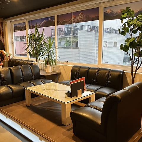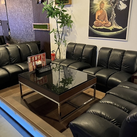 ゆったりと深く腰掛けられる、黒いレザー調のソファー席をご用意しております。こちらは6名様までご利用可能♪ローテーブルを囲んでリラックスしてお過ごしいただけます。壁にはアートが飾られた異国情緒あふれる空間で、女子会やグループ利用にぴったりです!