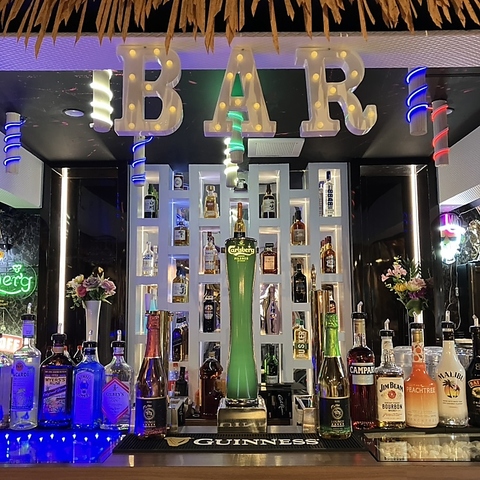 青いLEDが灯るムーディーな空間で、お一人様でも気兼ねなくお過ごしいただけるバーカウンター席。リゾート感あふれる茅葺き屋根風のデザインが目を引きます♪ズラリと並んだ豊富なお酒を眺めながら、しっとりとお酒を楽しめます◎