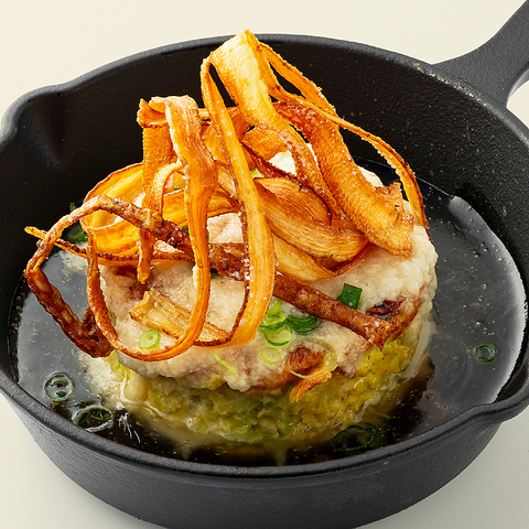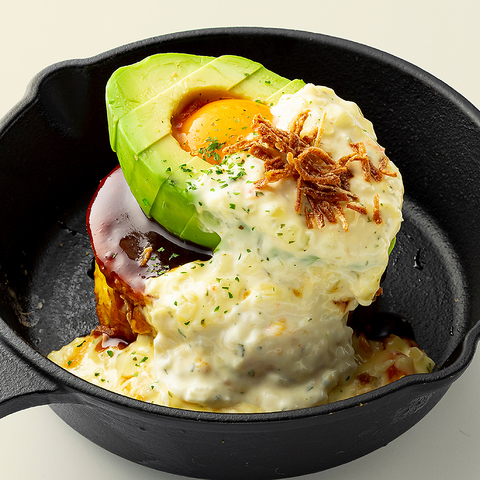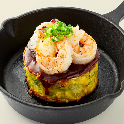 ふわトロに焼き上げた生地の上に、たっぷりの自家製ローストビーフといくらが乗った贅沢な一品。竹炭パウダーが練り込まれた黒い生地と、お肉といくらの赤のコントラストが映える、見た目も美しいメリグリおすすめのお好み焼きです!
