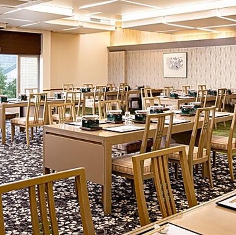 【テーブル席】桜のモチーフが彩る和の空間に、広々としたテーブル席をご用意しました。落ち着いた雰囲気の中でゆっくりと京会席を味わい、優雅なひとときを。レストランは車椅子にも対応しているため、どなたでも安心してご利用いただけます。