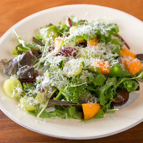 ボリュームたっぷりでデートであれば恋人とシェアするのに最適な一皿。その時に旬の果物を合わせたサラダです。シンプルにオリーブオイルと塩で味付け、パルメジャーノとブラックペッパーがアクセント。また、鶏もも肉のグリルは660円(税込)で可能でワンランク上のサラダにするのもおすすめです♪