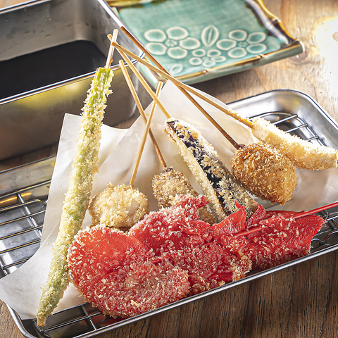 店長こだわりの串カツを厳選して盛り合わせます。アレルギーやこれ欲しいなどのご要望はお気軽にお伝えください。