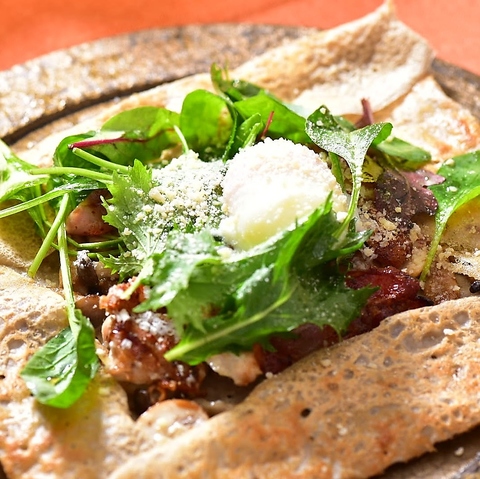 福井県産の無農薬原料をしようし創業以来伝わる石臼を使い、都度製粉している。石臼は20年寝かせたものを使用、そのお店ごとに違う蕎麦粉を製粉しています。その蕎麦粉を使用したガレットです。