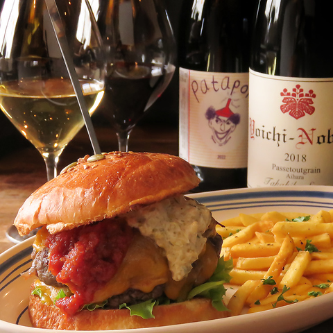 当店のハンバーガーで使うパティは和牛100%!バンズも一から手作りし、店内発酵させた生地を丁寧に焼き上げています。ボリューム感がありながらも食べやすい高さで、女性に嬉しいポイントです。店内でのお食事はもちろん、ハンバーガーとサイドメニューはテイクアウトも可能です。お気軽にお申し付けくださいませ!