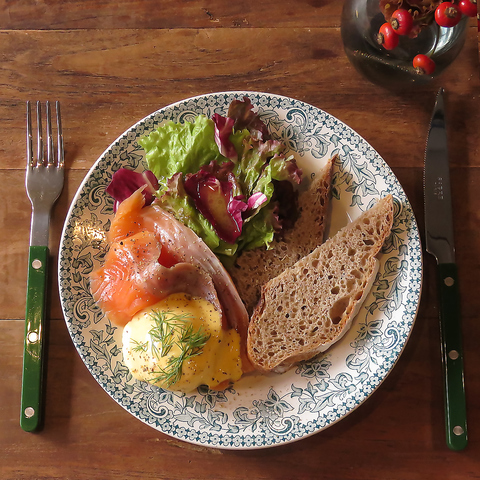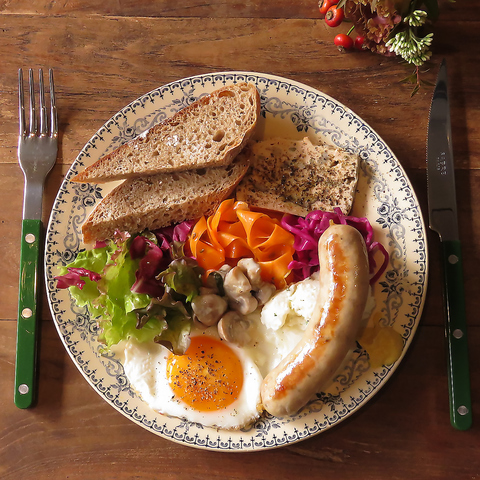 爽やかな一日の始まりに、シェフのこだわりが詰まったひと皿を。絶妙な焼き加減の目玉焼きと味わい深い自家製ソーセージをメインに、温菜・冷菜が絶妙なバランスで調和したプレートです◎自家製カンパーニュをあわせ、ゆったり朝食を堪能する充足した時間をお楽しみください。